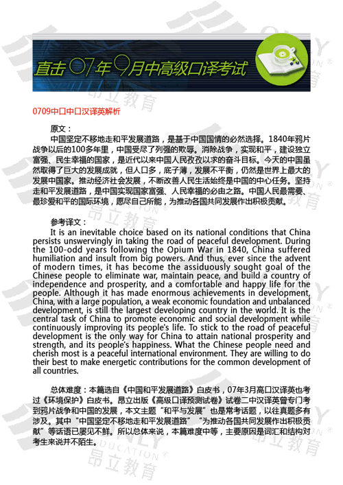 07年9月高级口译考试心得 今天参加了高口的考试。做完听力后,首先看的就是英译汉了。这部分有50分,老师说...