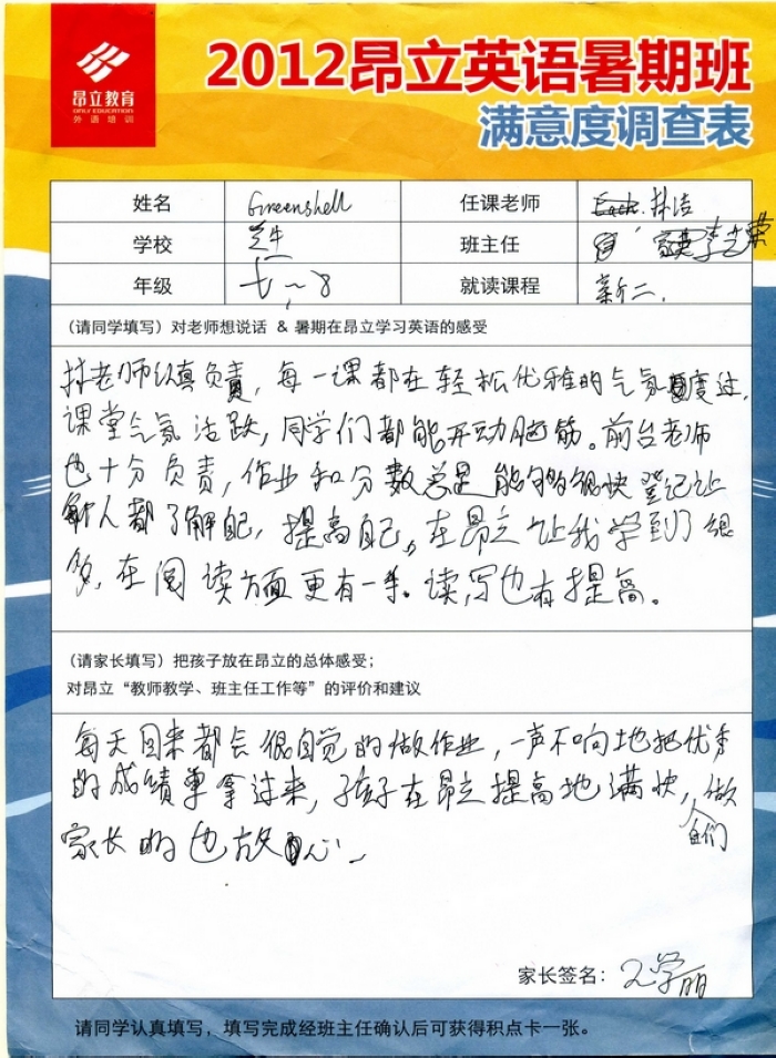 | 2012昂立英语暑假班满意度反馈表-Greenshell | |||