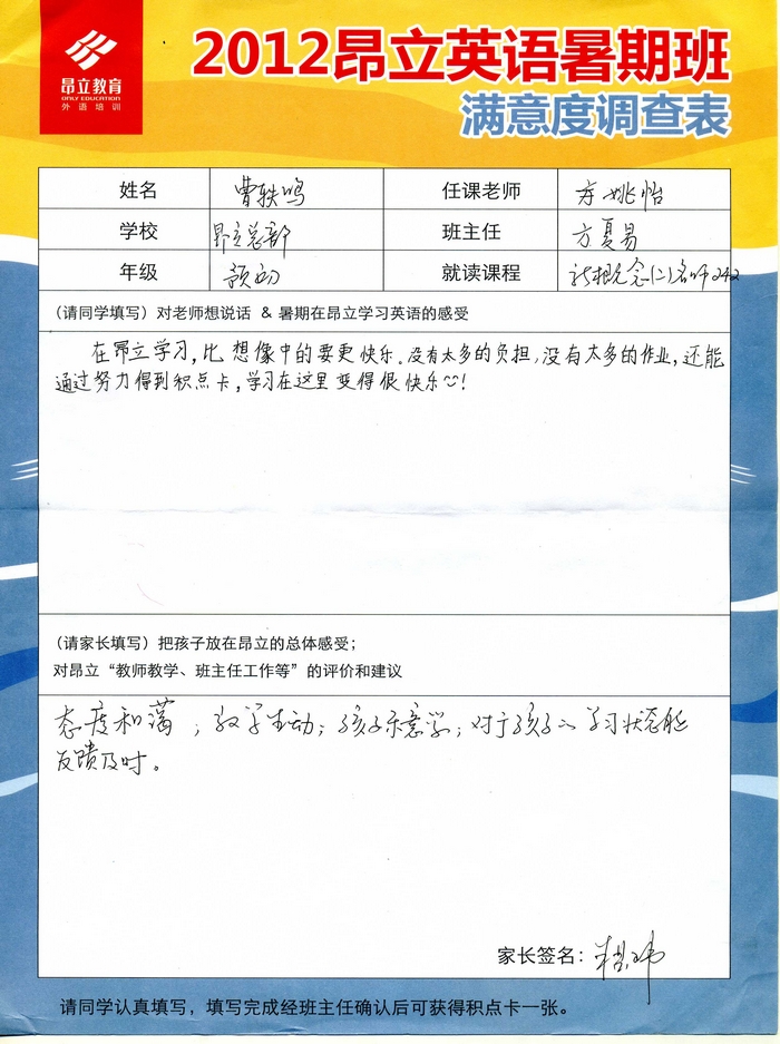 | 2012昂立英语暑假班满意度反馈表-曹轶鸣 | |||
