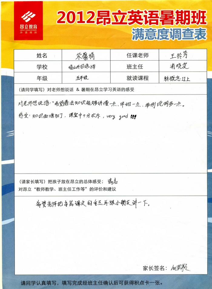 | 2012昂立英语暑假班满意度反馈表-柴馨旖 | |||