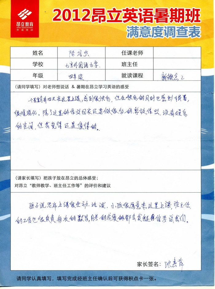 | 2012昂立英语暑假班满意度反馈表-陈培杰 | |||