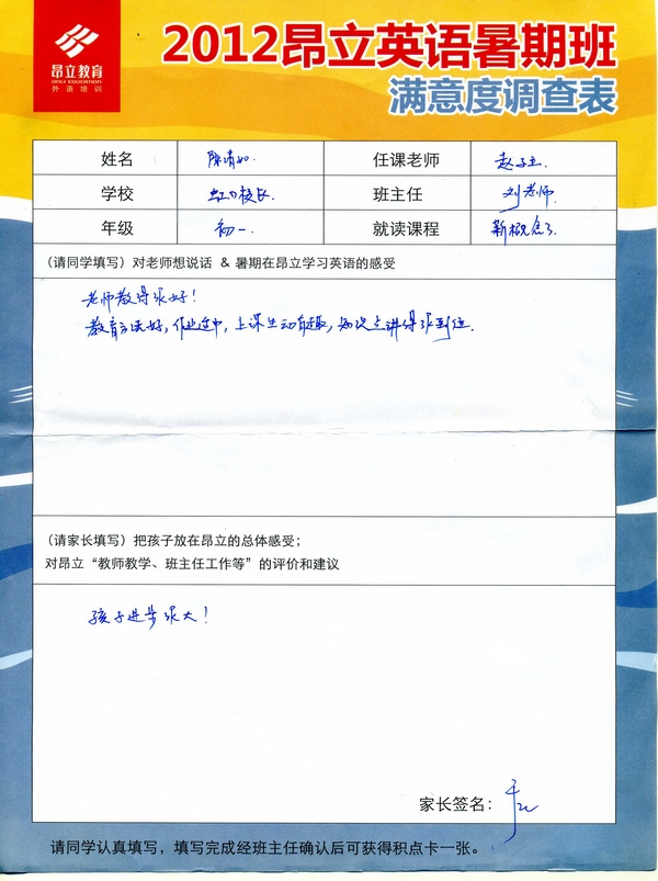| 2012昂立英语暑假班满意度反馈表-陈倩如 | |||