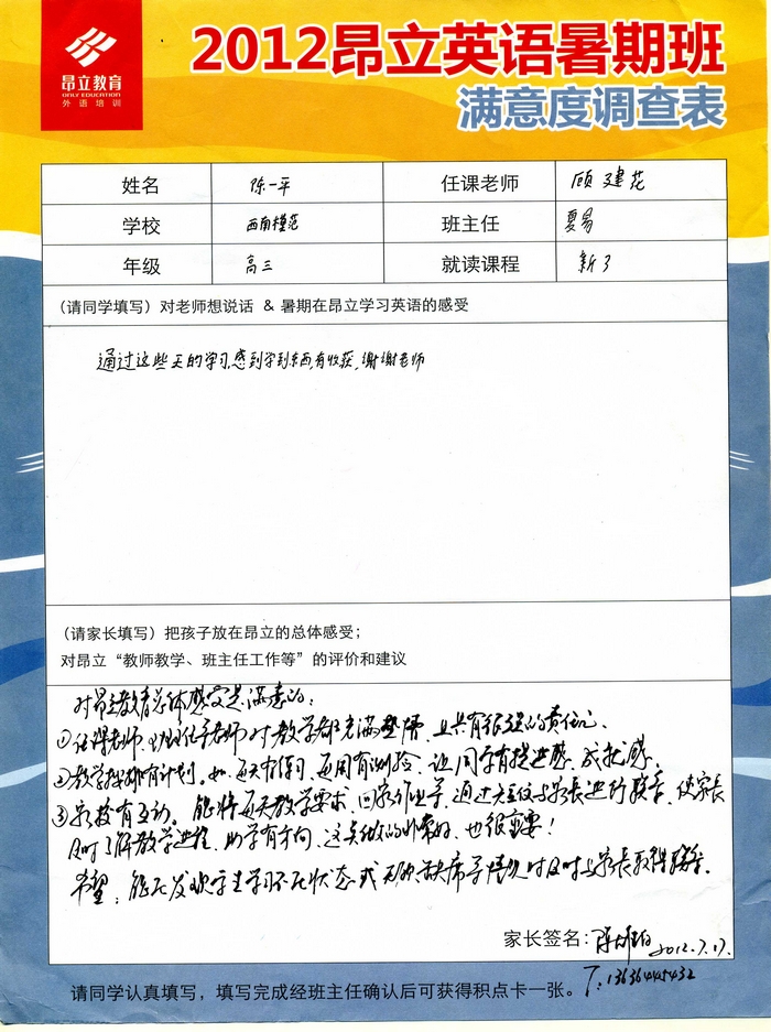 | 2012昂立英语暑假班满意度反馈表-陈一平 | |||
