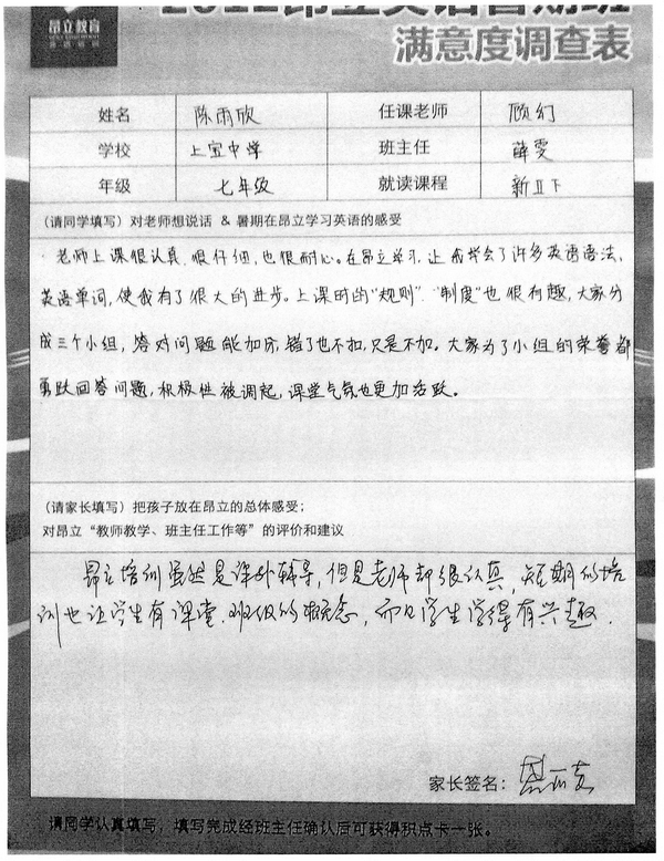 | 2012昂立英语暑假班满意度反馈表-陈雨欣 | |||
