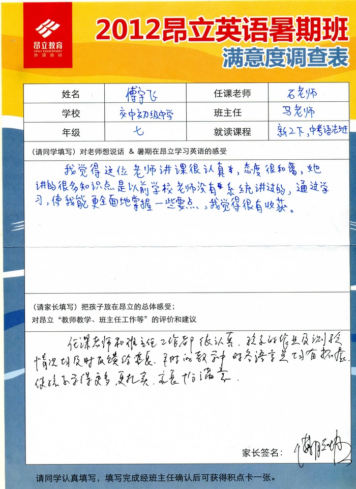 | 2012昂立英语暑假班满意度反馈表-傅宇飞 | |||