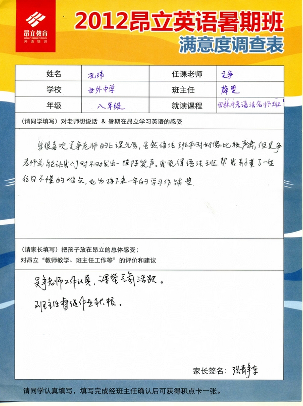 | 2012昂立英语暑假班满意度反馈表-孔玮 | |||