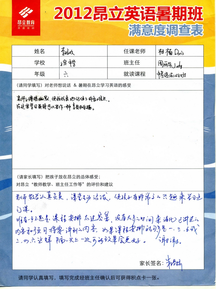 | 2012昂立英语暑假班满意度反馈表-李琼玖 | |||