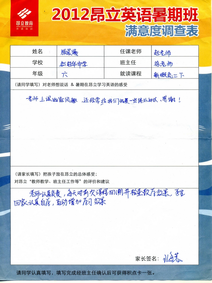 | 2012昂立英语暑假班满意度反馈表-顾晨曦 | |||