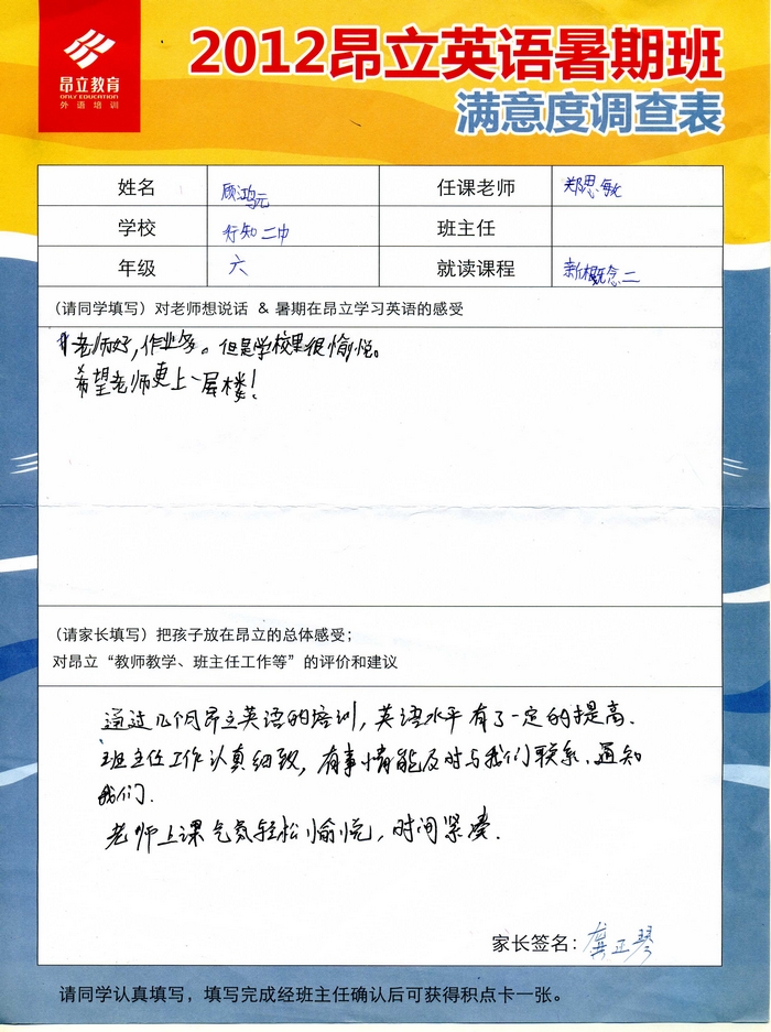 | 2012昂立英语暑假班满意度反馈表-顾鸿元 | |||