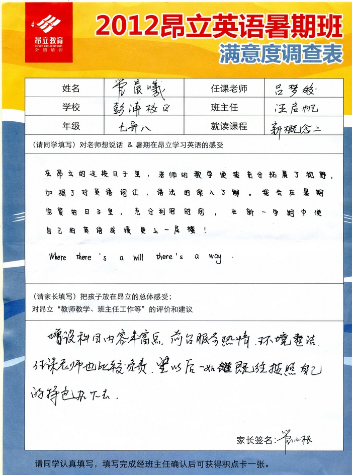 | 2012昂立英语暑假班满意度反馈表-管晨曦 | |||