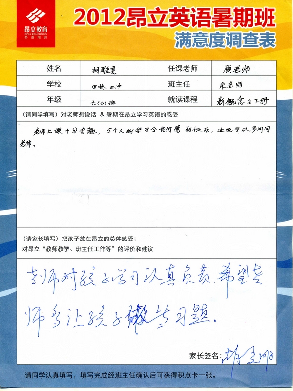 | 2012昂立英语暑假班满意度反馈表-胡雅雯 | |||