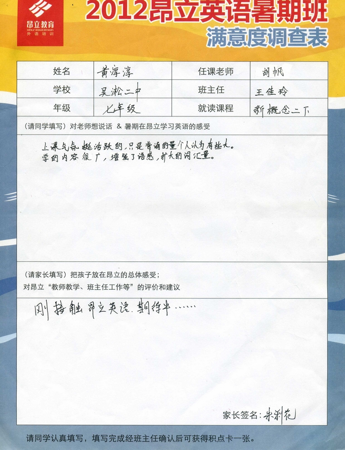 | 2012昂立英语暑假班满意度反馈表-黄淳淳 | |||