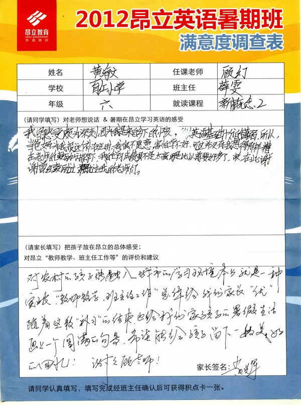 | 2012昂立英语暑假班满意度反馈表-黄海文 | |||