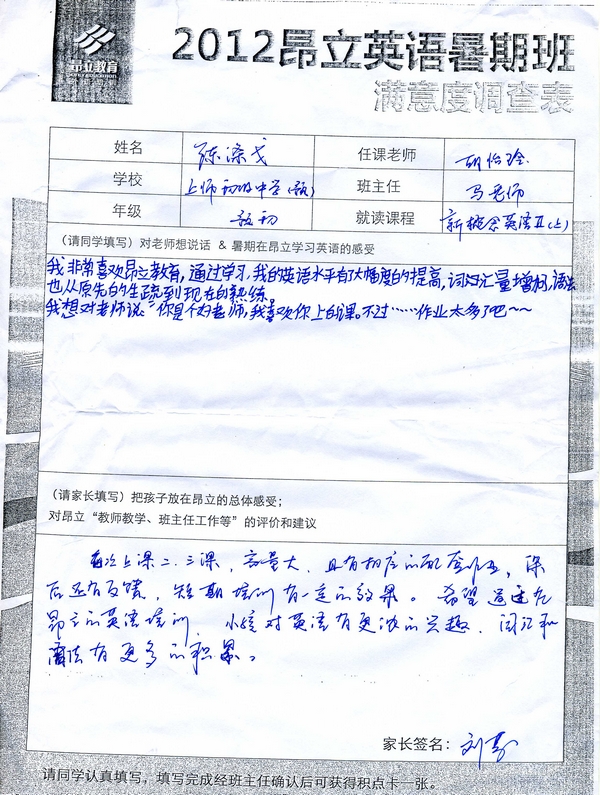 | 2012昂立英语暑假班满意度反馈表-陈涤戈 | |||