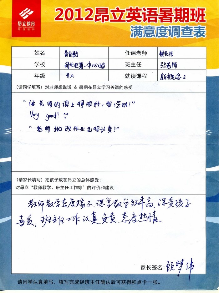 | 2012昂立英语暑假班满意度反馈表-黄自勤 | |||