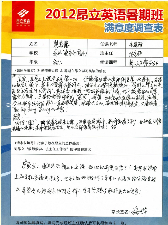 | 2012昂立英语暑假班满意度反馈表-瞿紫馨 | |||