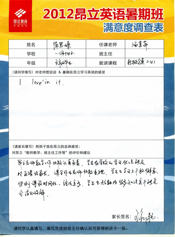 | 2012昂立英语暑假班满意度反馈表-陈思嵘 | |||