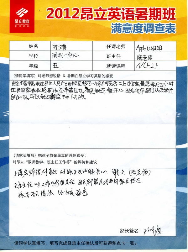 | 2012昂立英语暑假班满意度反馈表-陈文隽 | |||