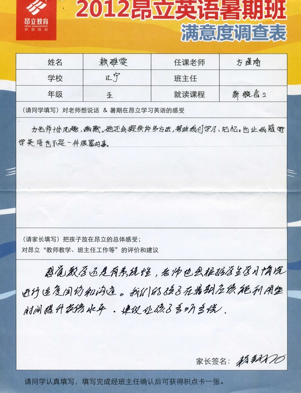 | 2012昂立英语暑假班满意度反馈表-赖雅雯 | |||