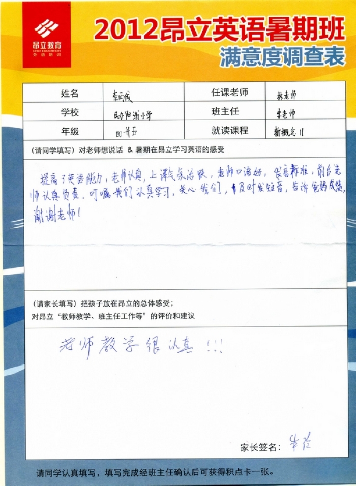| 2012昂立英语暑假班满意度反馈表-李丙成 | |||
