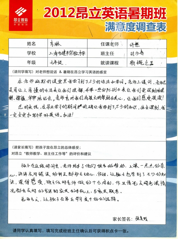 | 2012昂立英语暑假班满意度反馈表-李琳 | |||