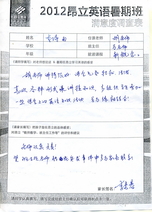 | 2012昂立英语暑假班满意度反馈表-李诗雨 | |||