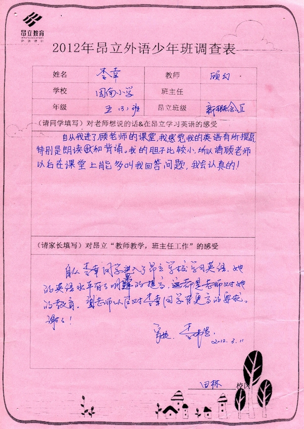 | 2012昂立英语暑假班满意度反馈表-李幸 | |||