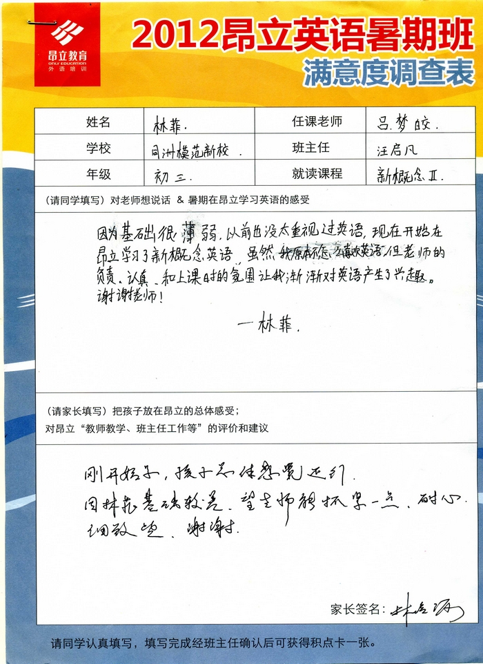 | 2012昂立英语暑假班满意度反馈表-林菲 | |||