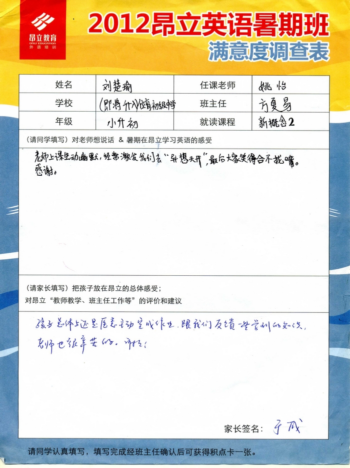 | 2012昂立英语暑假班满意度反馈表-刘楚瑜 | |||