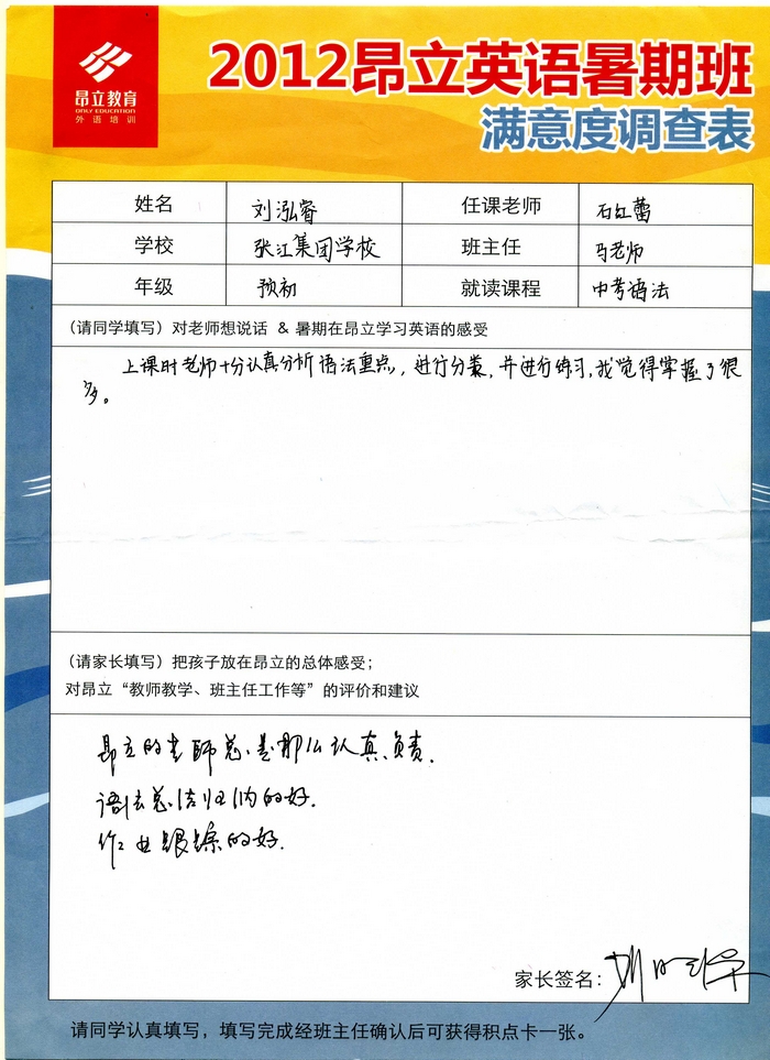 | 2012昂立英语暑假班满意度反馈表-刘泓睿 | |||