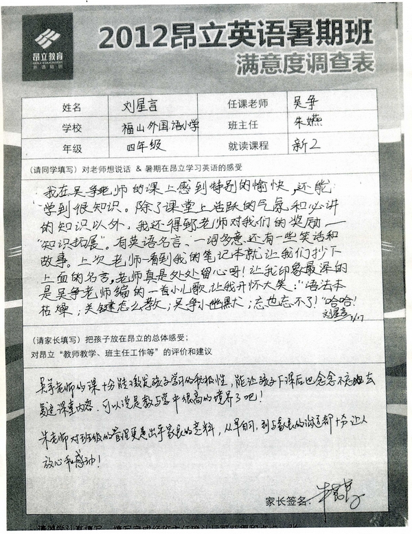 | 2012昂立英语暑假班满意度反馈表-刘星言 | |||