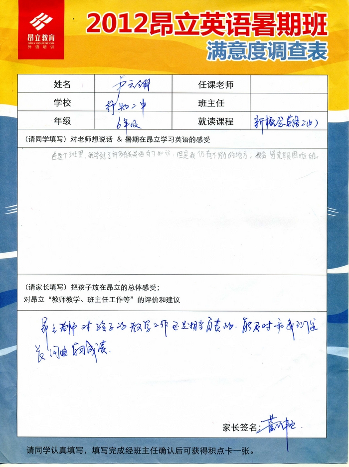 | 2012昂立英语暑假班满意度反馈表-卢云翎 | |||