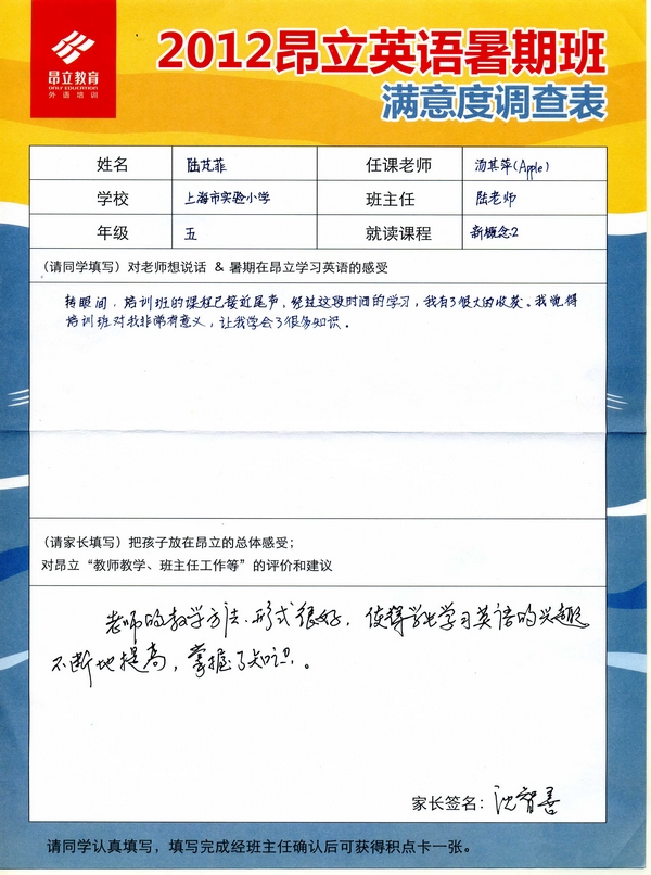 | 2012昂立英语暑假班满意度反馈表-陆芃菲 | |||