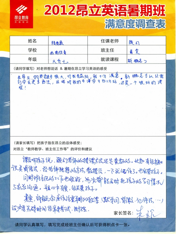 | 2012昂立英语暑假班满意度反馈表-陆妤盈 | |||