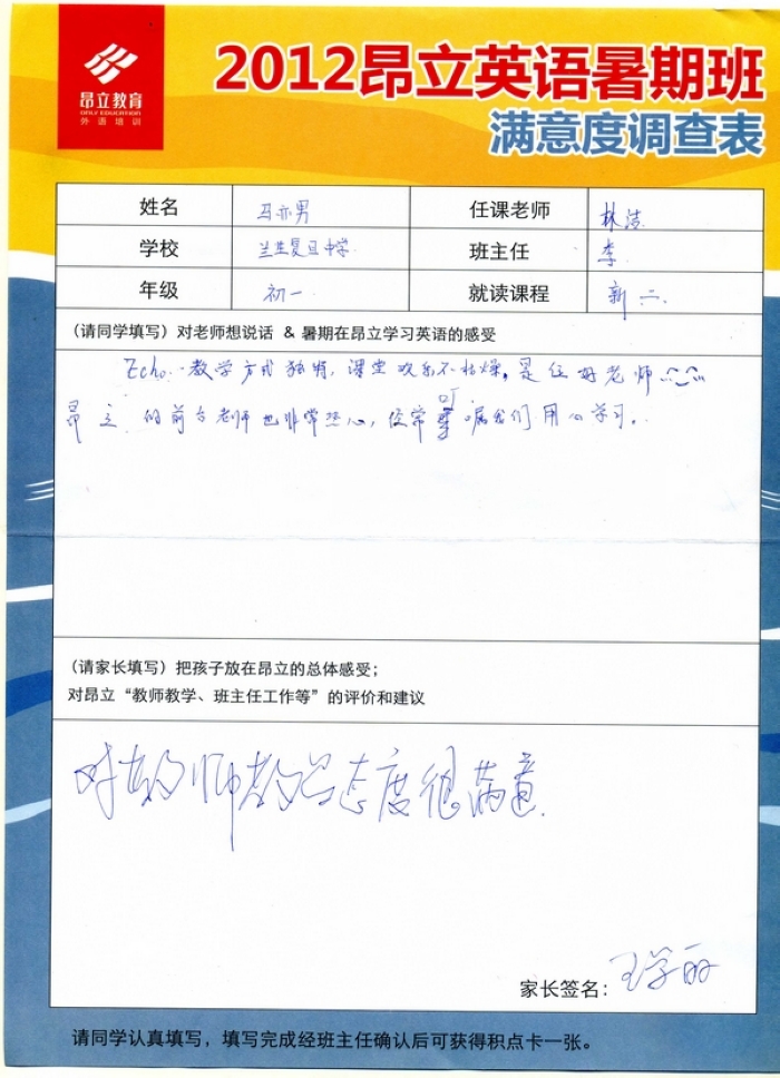 | 2012昂立英语暑假班满意度反馈表-马亦男 | |||