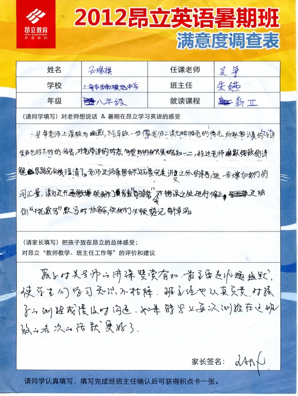 | 2012昂立英语暑假班满意度反馈表-宓瑞祺 | |||