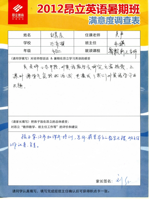 | 2012昂立英语暑假班满意度反馈表-彭晨辰 | |||