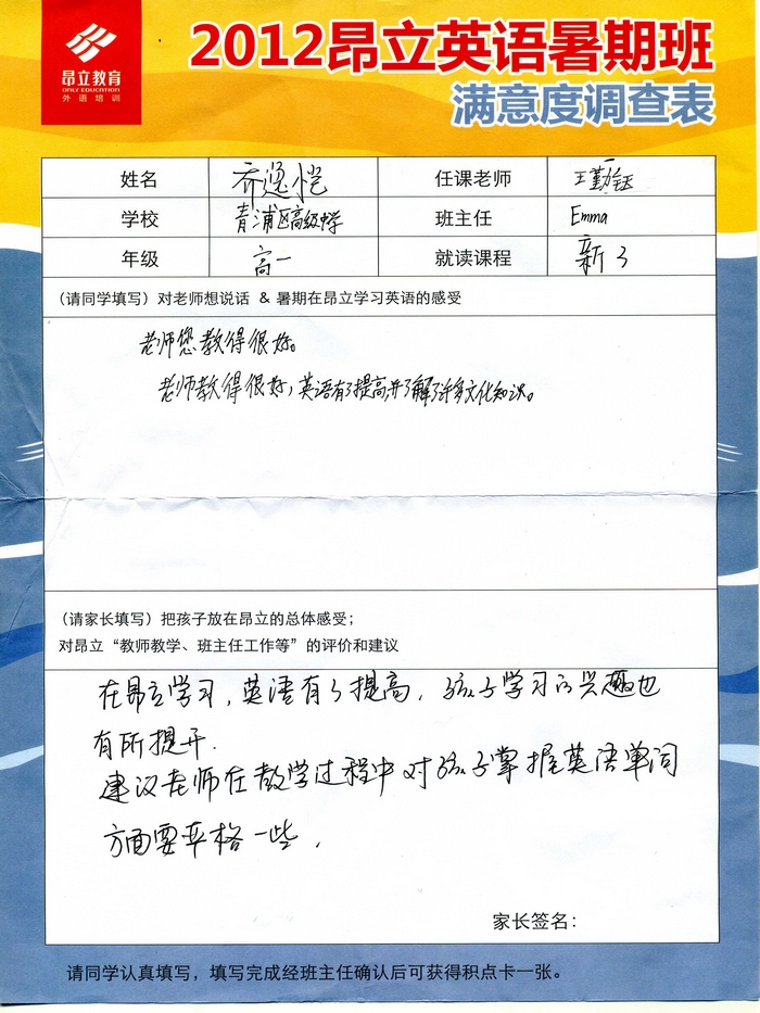 | 2012昂立英语暑假班满意度反馈表-齐逸恺 | |||