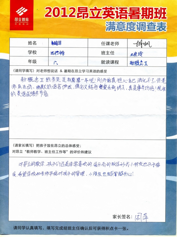 | 2012昂立英语暑假班满意度反馈表-秦镕弈 | |||