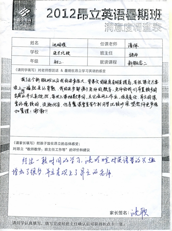 | 2012昂立英语暑假班满意度反馈表-沈明暄 | |||