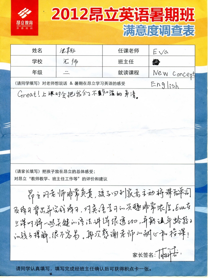 | 2012昂立英语暑假班满意度反馈表-沈芊钰 | |||