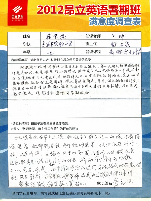 | 2012昂立英语暑假班满意度反馈表-盛玺澄 | |||