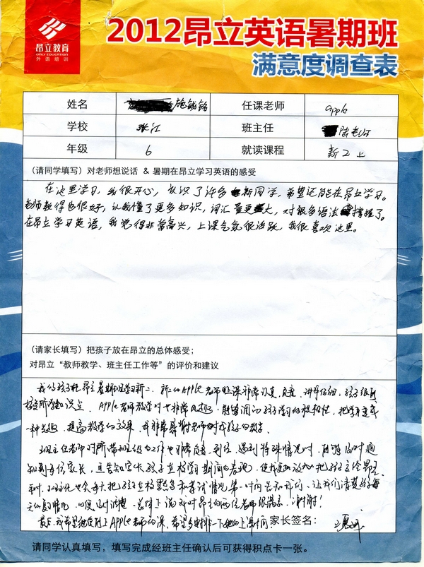 | 2012昂立英语暑假班满意度反馈表-施铖铭 | |||
