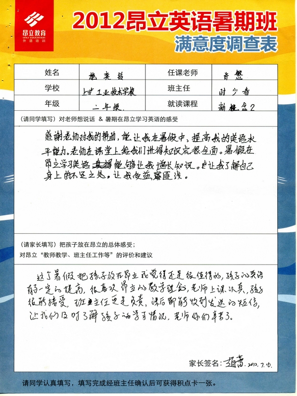 | 2012昂立英语暑假班满意度反馈表-施奕铃 | |||