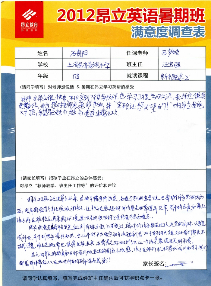 | 2012昂立英语暑假班满意度反馈表-石贵阳 | |||