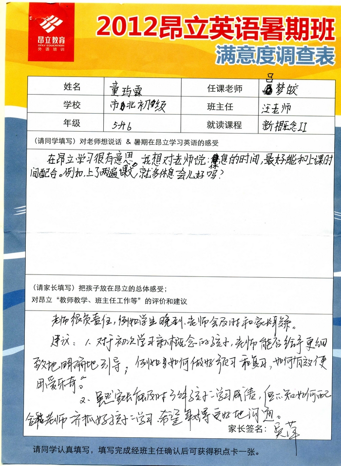 | 2012昂立英语暑假班满意度反馈表-童屿霖 | |||