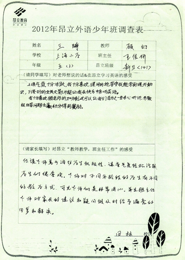 | 2012昂立英语暑假班满意度反馈表-王琦 | |||