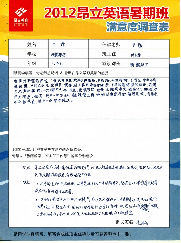 | 2012昂立英语暑假班满意度反馈表-王音 | |||