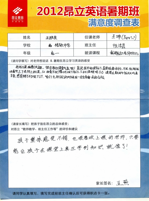 | 2012昂立英语暑假班满意度反馈表-王朕昊 | |||