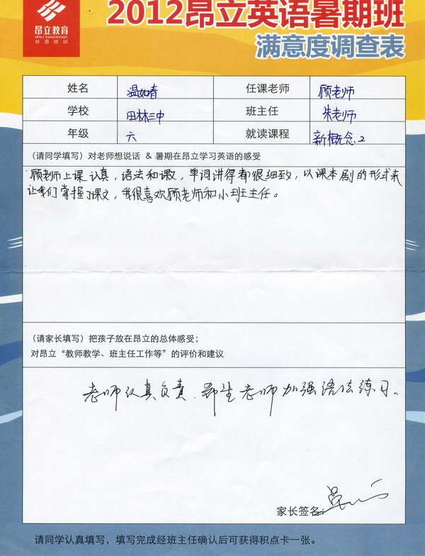| 2012昂立英语暑假班满意度反馈表-温如春 | |||